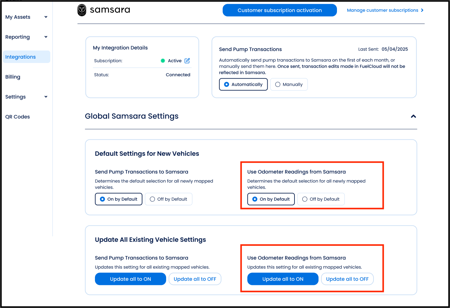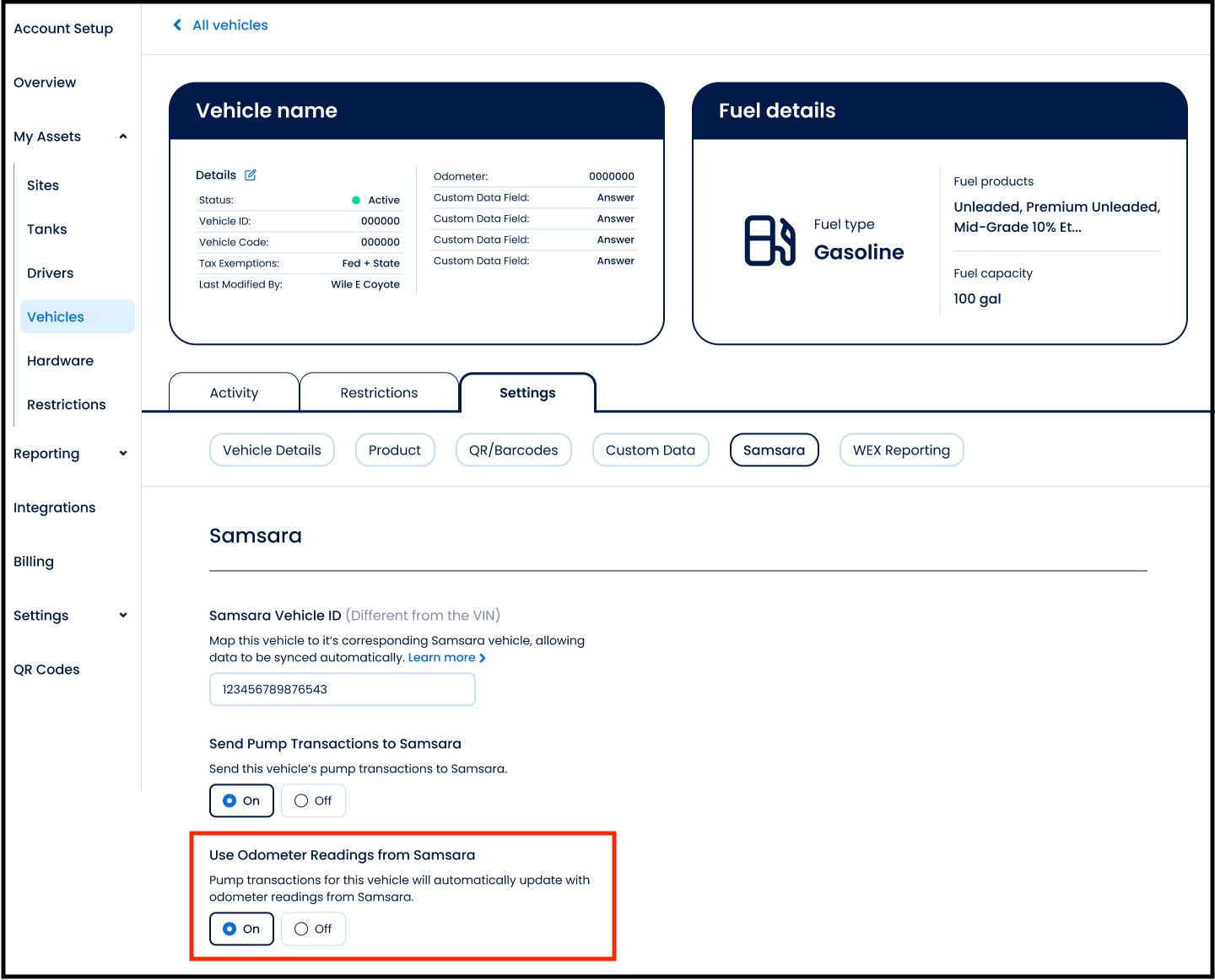 Pump transactions on FuelCloud can be automatically updated with odometer readings from Samsara. This eliminates the need for drivers to enter the value when pumping.